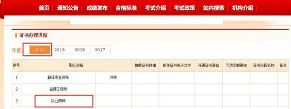 其實(shí),關(guān)于2020年執(zhí)業(yè)藥師合格證書(shū)辦理進(jìn)度大家可以通過(guò)中國(guó)人事考試網(wǎng)進(jìn)行自主查詢(xún)。