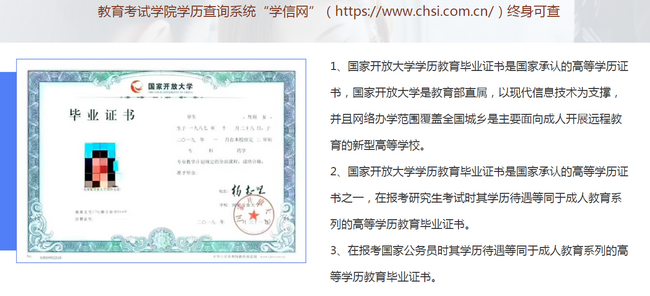 國家開放大學的學歷在學信網(wǎng)上可以永久查詢,畢業(yè)證無“成人教育”、“業(yè)余”、“函授”等字樣,本科符合條件者可申請學位證書。國家開放大學的證書用來考研、考公務員、評職稱、考資格證都是全國認可的。