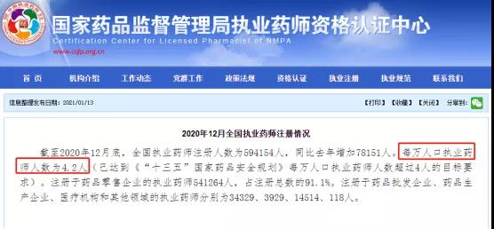 截至2020年12月底,全國執(zhí)業(yè)藥師注冊人數(shù)為594154人,同比去年增加78151人。每萬人口執(zhí)業(yè)藥師人數(shù)為4.2人(已達(dá)到《“十三五”國家藥品安全規(guī)劃》每萬人口執(zhí)業(yè)藥師人數(shù)超過4人的目標(biāo)要求)。但對比歐美發(fā)達(dá)國家,每800——1500人里面就配有1名執(zhí)業(yè)藥師,我國平均2380人里才有1名執(zhí)業(yè)藥師,按照發(fā)展來看我國還有100萬名左右執(zhí)業(yè)藥師的缺口,需求巨大,就業(yè)前景美好。