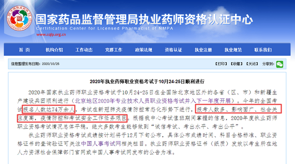 國家藥品監(jiān)督管理局執(zhí)業(yè)藥師資格認(rèn)證中心通知, 2020年執(zhí)業(yè)藥師職業(yè)資格考試全國報(bào)名人數(shù)達(dá)74萬余人,與2019年相比有所下降。