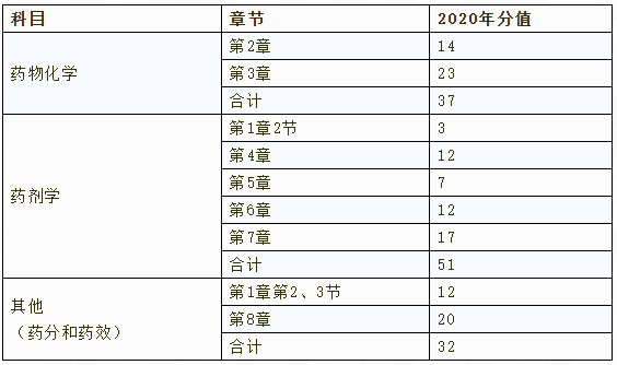 通過表格來直觀看下《藥一》中這三部分(藥物化學(xué)、藥劑學(xué)和其他)的分值比例情況。
