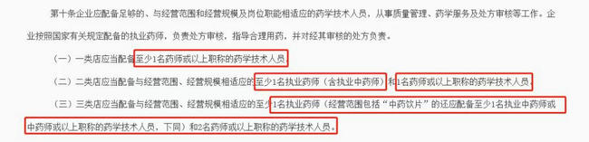 根據(jù)廣東省2018年頒布的《關(guān)于藥品零售企業(yè)分級(jí)分類的管理辦法(試行)》,該辦法中提出,經(jīng)營范圍包括“中藥飲片”的還應(yīng)配備至少1名執(zhí)業(yè)中藥師。這就意味著,三類店中如果有雙證執(zhí)業(yè)藥師,可以少配備一個(gè)藥學(xué)技術(shù)人員。