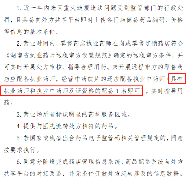 想必大家也注意到了,其中明確提到“未開(kāi)展遠(yuǎn)程審方的零售藥店應(yīng)配備執(zhí)業(yè)藥師,經(jīng)營(yíng)中藥飲片的還應(yīng)配備執(zhí)業(yè)中藥師”,但如有雙證資格的執(zhí)業(yè)藥師,就僅需配備1名即可。