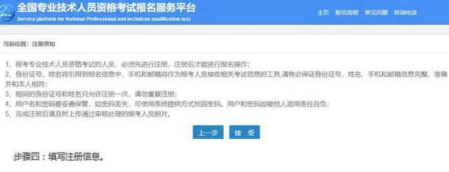 ①打開“全國專業(yè)技術(shù)人員資格考試報名服務(wù)平臺”,點(diǎn)擊注冊。②閱讀《專業(yè)技術(shù)人員資格考試網(wǎng)上報名協(xié)議》,點(diǎn)擊接受,即可進(jìn)行下一步。③此時系統(tǒng)會彈出“注冊須知”,各位新考生一定要認(rèn)真看清楚里面涉及注冊信息的要求。點(diǎn)擊“下一步”即可注冊。④新考生注冊就會出現(xiàn)下面這個頁面,大家按照要求填寫資料就可以了。