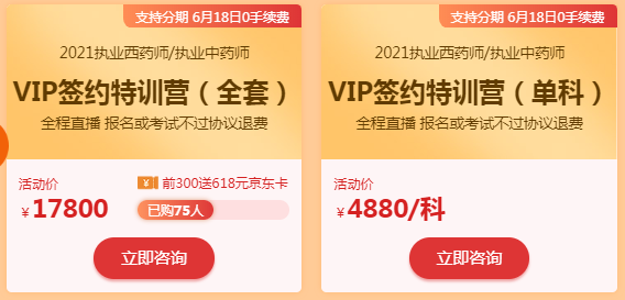 執(zhí)業(yè)藥師618VIP簽約特訓(xùn)營(yíng)年中大促,6月18日購(gòu)買2021年執(zhí)業(yè)藥師VIP簽約特訓(xùn)營(yíng)支持分期付款,前300名購(gòu)買全科送京東卡,所有購(gòu)買VIP簽約特訓(xùn)營(yíng)課程的學(xué)員贈(zèng)送正小保數(shù)學(xué)邏輯暑假班課程。