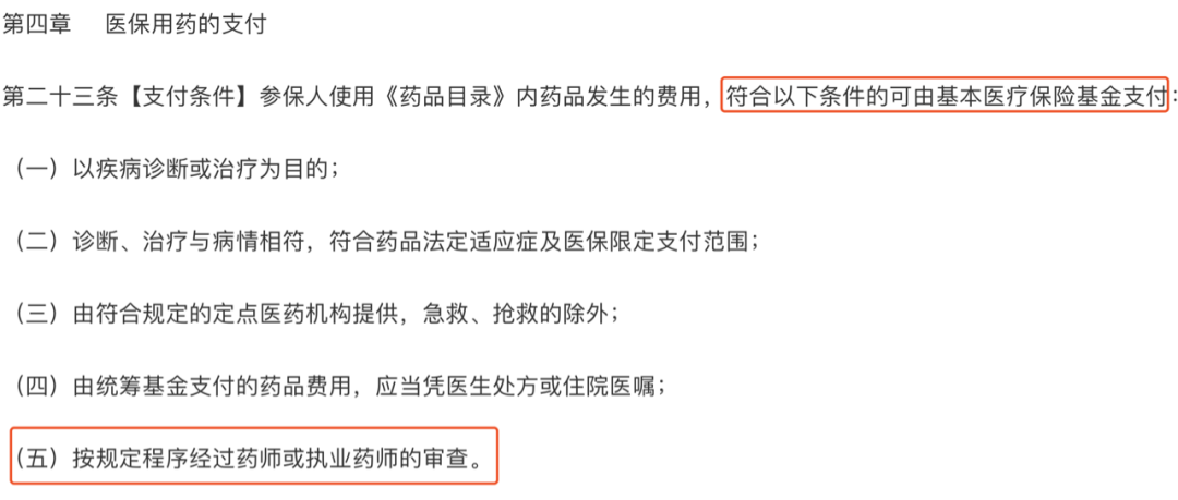 同時(shí),去年9月開始執(zhí)行的《基本醫(yī)療保險(xiǎn)用藥管理暫行辦法》也明確,醫(yī)保用藥的支付,需滿足“按規(guī)定程序經(jīng)過藥師或執(zhí)業(yè)藥師的審查”的條件。