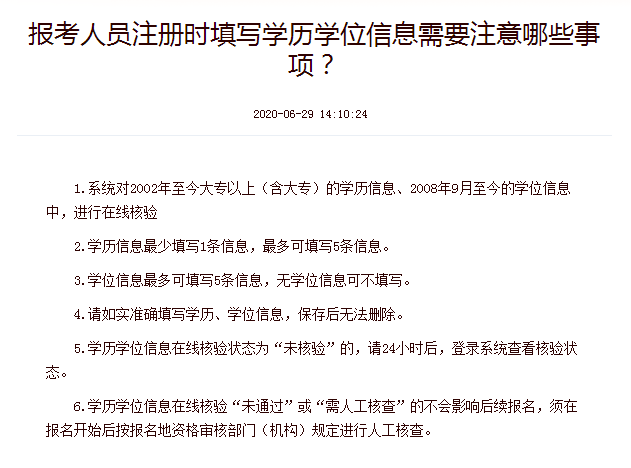 6.學(xué)歷學(xué)位信息在線核驗“未通過”或“需人工核查”的不會影響后續(xù)報名,須在報名開始后按報名地資格審核部門(機(jī)構(gòu))規(guī)定進(jìn)行人工核查。