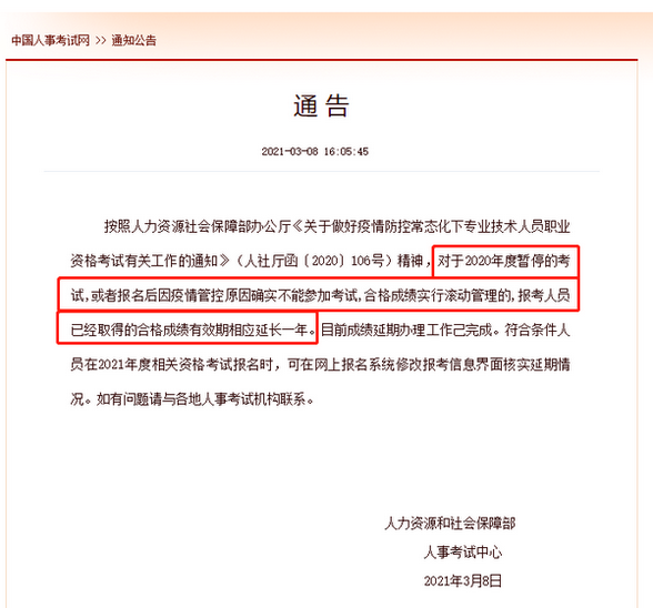 按照人力資源社會保障部辦公廳《關于做好疫情防控常態(tài)化下專業(yè)技術人員職業(yè)資格考試有關工作的通知》(人社廳函﹝2020﹞106號)精神,對于2020年度暫停的考試,或者報名后因疫情管控原因確實不能參加考試,合格成績實行滾動管理的,報考人員已經(jīng)取得的合格成績有效期相應延長一年。目前成績延期辦理工作己完成。符合條件人員在2021年度相關資格考試報名時,可在網(wǎng)上報名系統(tǒng)修改報考信息界面核實延期情況。如有問題請與各地人事考試機構聯(lián)系。