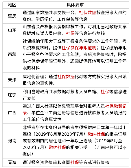 有的地區(qū)還會要求“社會保險參保累計繳納年限應不少于報考條件中相應的工作年限”。不過具體還是得看具體地區(qū)的具體要求。
