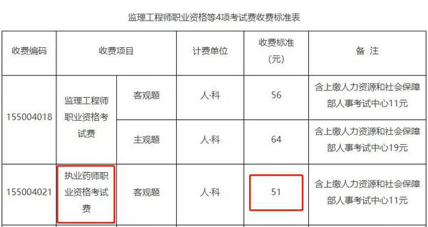 3月份,北京市發(fā)改委重新核定了4項(xiàng)國(guó)家專(zhuān)業(yè)技術(shù)人員職業(yè)資格考試的收費(fèi)標(biāo)準(zhǔn),并且對(duì)這4項(xiàng)考試費(fèi)用進(jìn)行下調(diào),其中執(zhí)業(yè)藥師職業(yè)資格考試費(fèi)標(biāo)準(zhǔn)每人每科降低10元,最終收費(fèi)標(biāo)準(zhǔn)為51元。