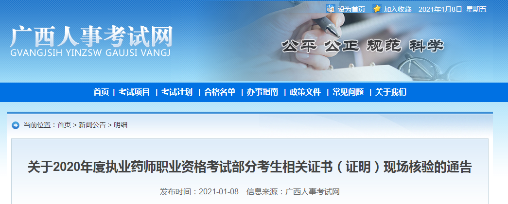 廣西2020執(zhí)業(yè)藥師考試部分考生相關(guān)證書(shū)(證明)現(xiàn)場(chǎng)核驗(yàn)通告