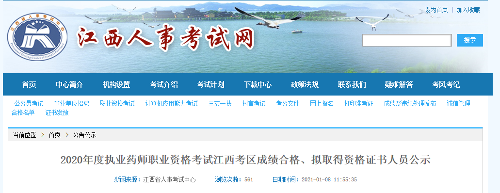 2020年度執(zhí)業(yè)藥師職業(yè)資格考試江西考區(qū)成績合格、擬取得資格證書人員公示
