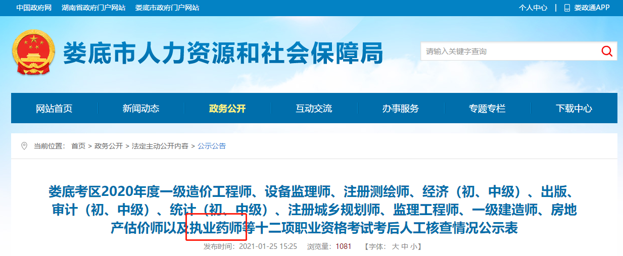 湖南婁底2020年執(zhí)業(yè)藥師考試考后人工核查情況公示