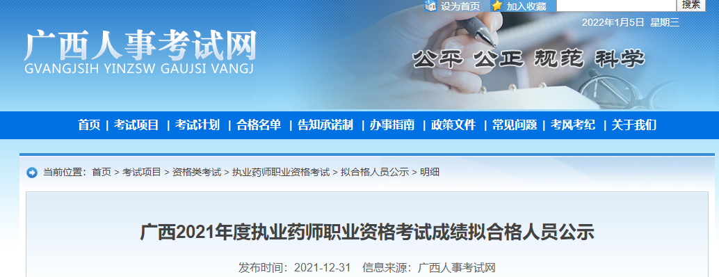 12月31日,廣西人事考試網(wǎng)發(fā)布了廣西2021年度執(zhí)業(yè)藥師職業(yè)資格考試成績擬合格人員公示,請各位考生注意,醫(yī)學教育網(wǎng)小編為大家整理詳情如下!