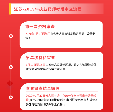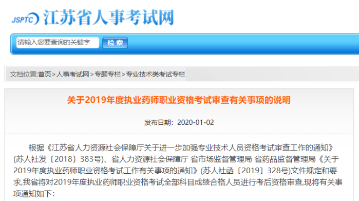 2020年1月2日,江蘇人事考試網(wǎng)發(fā)布了關于執(zhí)業(yè)藥師考后審查的說明,其中主要內(nèi)容包括明確了審查的對象、考后審查的時間及流程。