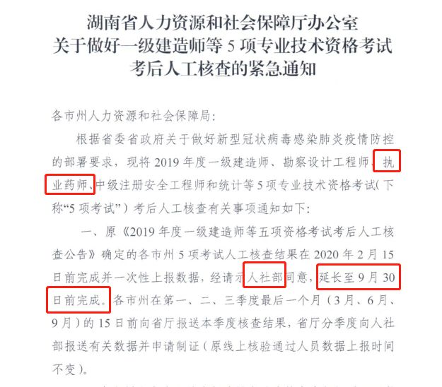 2020年1月30日,湖南省人力資源和社會保障廳公開了《關于做好一級建造師等5項專業(yè)技術資格考試考后人工核查的緊急通知》 ,其中考后人工核查延遲的考試包括執(zhí)業(yè)藥師。