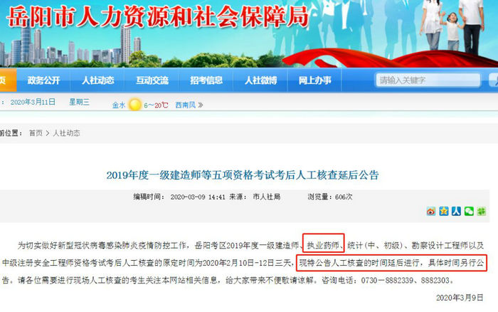 近日,湖南岳陽(yáng)市人社局發(fā)布了《2019年度一級(jí)建造師等五項(xiàng)資格考試考后人工核查延后公告》。詳情如下: