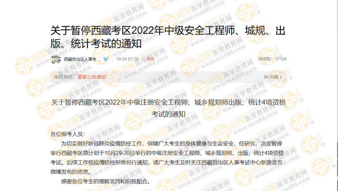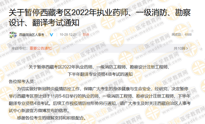 預(yù)告根據(jù)西藏自治區(qū)人事考試中心官方微博通知,西藏考區(qū)暫停2022年執(zhí)業(yè)藥師、一級消防工程師、勘察設(shè)計注冊工程師、下半年翻譯專業(yè)資格4項考試,具體內(nèi)容如下,請廣大考生知曉。