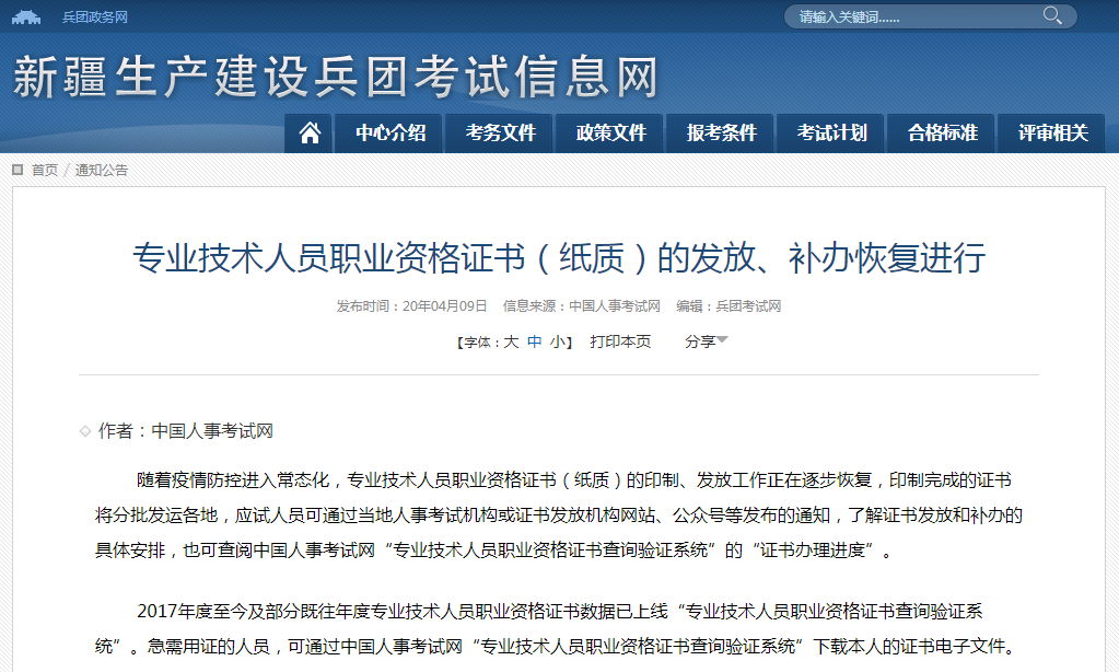 最近,新疆生產建設兵團考試信息網(wǎng)發(fā)布了“專業(yè)技術人員職業(yè)資格證書(紙質)的發(fā)放、補辦恢復進行”的內容,醫(yī)學教育網(wǎng)小編為大家整理如下。