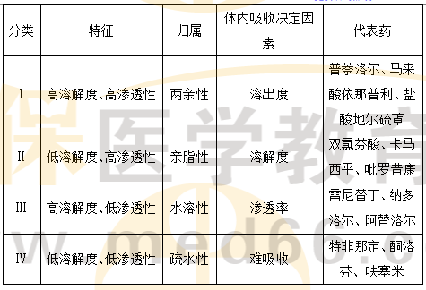 【解析】根據(jù)藥物溶解度和滲透性的不同組合將藥物分為四類,第I類是高溶解度、高滲透性的兩親性分子藥物,其體內(nèi)吸收取決于溶出度,如普萘洛爾、馬來酸依那普利、鹽酸地爾硫(艸卓)等;第Ⅱ類是低溶解度、高滲透性的親脂性分子藥物,其體內(nèi)吸收取決于溶解度,如雙氯芬酸、卡馬西平、吡羅昔康等;第Ⅲ類是高溶解度、低滲透性的水溶性分子藥物,其體內(nèi)吸收受滲透率,如雷尼替丁、納多洛爾、阿替洛爾等;第IV類是低溶解度、低滲透性的疏水性分子藥物,其體內(nèi)吸收比較困難,如特非那定、酮洛芬、呋塞米等。
