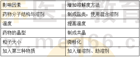 【解析】影響藥物溶解度的因素:藥物分子結(jié)構(gòu)與溶劑、溫度、晶型、粒子大小和加入第三種物質(zhì)。