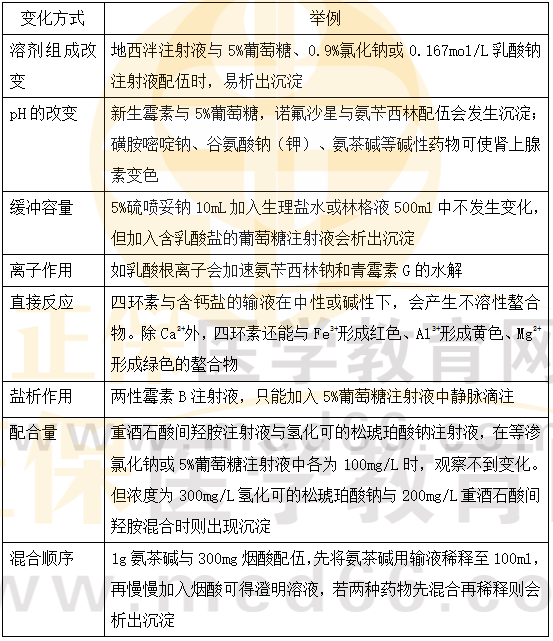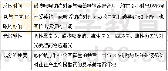 【解析】本題主要考查注射劑配伍變化的主要原因。注射劑配伍變化的主要原因有:溶劑組成改變、pH改變、緩沖容量、離子作用、直接反應(yīng)、鹽析作用、配合量、混合的順序、反應(yīng)時間、氧與二氧化碳的影響、光敏感性和成分的純度。
