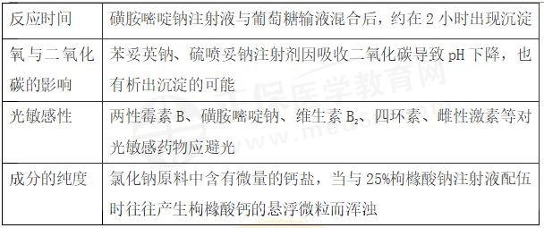 【解析】本題主要考查注射劑配伍變化的主要原因。注射劑配伍變化的主要原因有:溶劑組成改變、pH改變、緩沖容量、離子作用、直接反應(yīng)、鹽析作用、配合量、混合的順序、反應(yīng)時(shí)間、氧與二氧化碳的影響、光敏感性和成分的純度。
