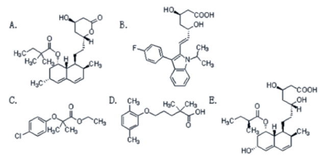 A是辛伐他汀,屬于前藥;B是氟伐他汀,第一個(gè)通過(guò)全合成得到的他汀類藥物。E是普伐他汀,半合成改造的藥物。