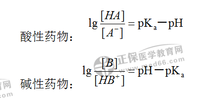 有機(jī)藥物多數(shù)為弱酸或弱堿,體內(nèi)不同部位pH不同,影響藥物的解離,解離型和非解離型藥物的比例關(guān)系如下: