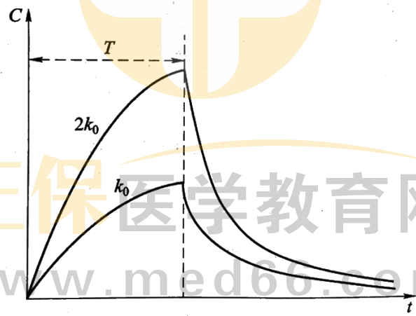 靜脈滴注是以恒定速度向血管內(nèi)給藥的方式。在滴注時(shí)間T之內(nèi),以恒定速度k0增加藥量,同時(shí)又以一級(jí)速度過(guò)程從體內(nèi)消除。當(dāng)?shù)巫⒔Y(jié)束后,體內(nèi)才只有消除過(guò)程。想象一個(gè)水池,一邊恒速往里灌水,一邊往外排水。開(kāi)始水量少,排水速度慢;隨著水量增加,排水速度逐漸增加,直到二者相等,水量持平。灌水結(jié)束后,只剩下排水。