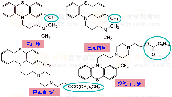 2.硫雜蒽類:噻噸類。氯普噻噸(順式異構(gòu)體的抗精神病活性大于反式異構(gòu)體)、珠氯噻醇(較適合于老年人)、氟哌噻噸(三氟甲基)。
