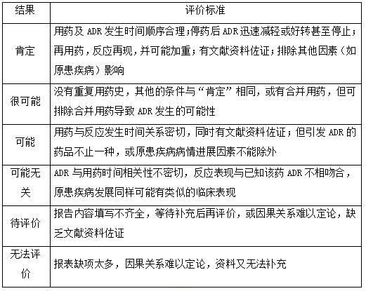 【解析】不良反應的評價結果有6級,即:肯定、很可能、可能、可能無關、待評價、無法評價。肯定:用藥及反應發(fā)生時間順序合理;停藥以后反應停止,或迅速減輕或好轉(根據(jù)機體免疫狀態(tài),某些ADR反應可出現(xiàn)在停藥數(shù)天以后);再次使用,反應再現(xiàn),并可能明顯加重(即激發(fā)試驗陽性);有文獻資料佐證;排除原患疾病等其他混雜因素影響。
