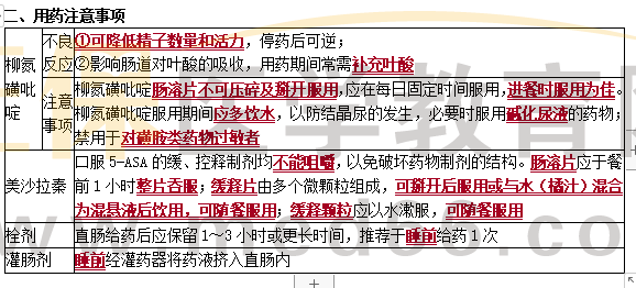 『答案解析』美沙拉嗪緩釋片由多個(gè)微顆粒組成,可掰開(kāi)后服用或與水(橘汁)混合為混懸液后飲用,可隨餐服用;柳氮磺吡啶用藥期間需常規(guī)補(bǔ)充葉酸;灌腸劑睡前經(jīng)灌藥器將藥液擠入直腸內(nèi);既需要監(jiān)測(cè)腎功能也需要監(jiān)測(cè)血常規(guī)。