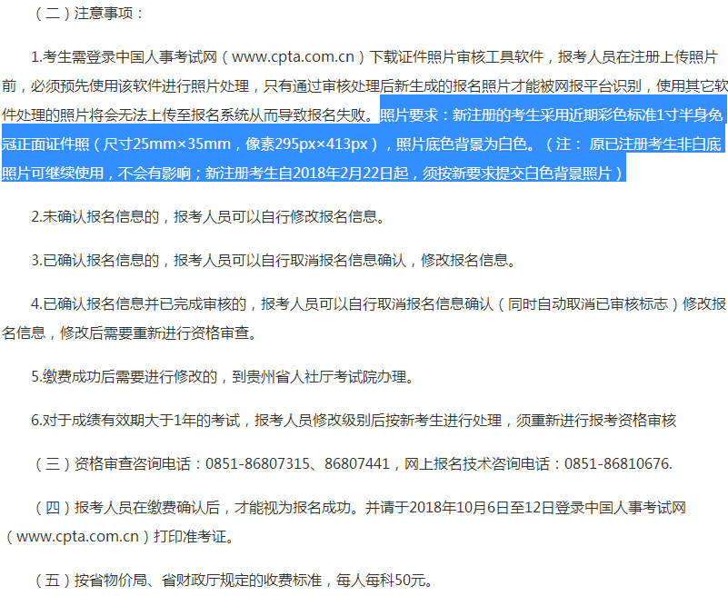 今年報名時對照片有了新要求,具體要求如下:照片要求:新注冊的考生采用近期彩色標準1寸半身免冠正面證件照(尺寸25mm×35mm,像素295px×413px),照片底色背景為白色。(注: 原已注冊考生非白底照片可繼續(xù)使用,不會有影響;新注冊考生自2018年2月22日起,須按新要求提交白色背景照片)