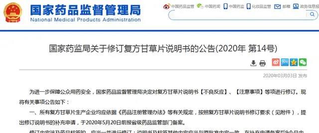 2020年3月,國(guó)家藥監(jiān)局于官網(wǎng)發(fā)布《關(guān)于修訂復(fù)方甘草片說(shuō)明書(shū)的公告》(以下簡(jiǎn)稱(chēng)"公告")稱(chēng),為進(jìn)一步保障公眾用藥安全,國(guó)家藥品監(jiān)督管理局決定對(duì)復(fù)方甘草片說(shuō)明書(shū)【不良反應(yīng)】、【注意事項(xiàng)】等項(xiàng)進(jìn)行修訂。