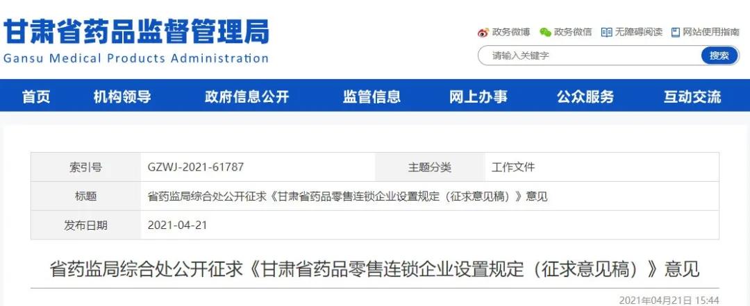 甘肅省藥品監(jiān)督管理局發(fā)布了《省藥監(jiān)局綜合處公開征求《甘肅省藥品零售連鎖企業(yè)設置規(guī)定(征求意見稿)》意見》(以下簡稱《意見稿》)。