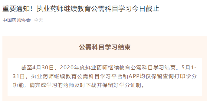 截至4月30日,2020年度執(zhí)業(yè)藥師繼續(xù)教育公需科目學(xué)習(xí)結(jié)束。5月1-31日,執(zhí)業(yè)藥師繼續(xù)教育公需科目學(xué)習(xí)平臺和APP均僅保留查詢打印學(xué)分功能,請完成學(xué)習(xí)的藥師及時下載并保留好學(xué)分證明。