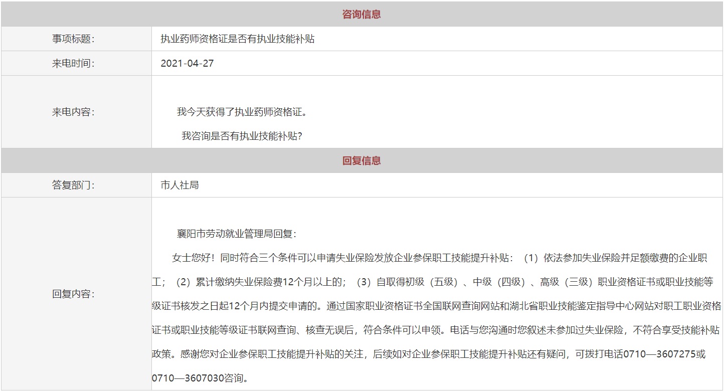 有人向襄陽市人民政府來電提問:獲得了執(zhí)業(yè)藥師資格證,是否有執(zhí)業(yè)技能補(bǔ)貼?市人社局就此進(jìn)行了回復(fù)。2021年湖北襄陽執(zhí)業(yè)藥師資格證是否有執(zhí)業(yè)技能補(bǔ)貼?