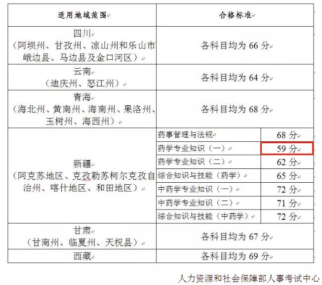 新疆喀什等4個地區(qū)的《藥學(xué)專業(yè)知識(一)》合格標(biāo)準(zhǔn)是59分,為“三區(qū)三州”中最低分,其它科目在62分-72分之間,中藥學(xué)專業(yè)知識二減少1分,其他中藥科目還是72分。