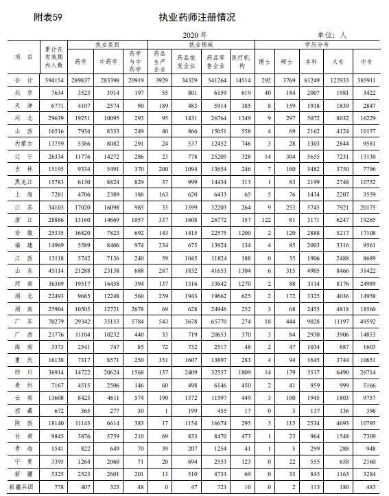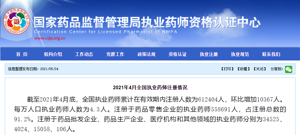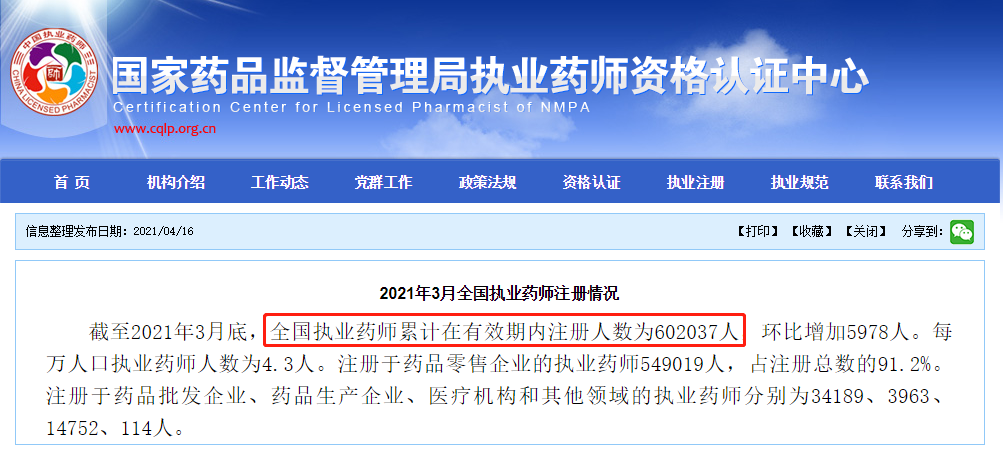 這個(gè)數(shù)據(jù)僅統(tǒng)計(jì)到2020年,而根據(jù)國(guó)家藥監(jiān)局公布的2021年4月數(shù)據(jù)來(lái)看,全國(guó)執(zhí)業(yè)藥師累計(jì)在有效期內(nèi)注冊(cè)人數(shù)已經(jīng)超過(guò)了61萬(wàn)人。