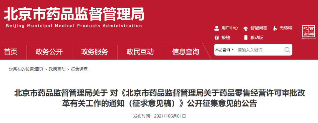 6月1日,北京市藥品監(jiān)督管理局發(fā)布了《北京市藥品監(jiān)督管理局關(guān)于藥品零售經(jīng)營許可審批改革有關(guān)工作的通知(征求意見稿)》(以下簡稱《意見稿》),公開向社會征求意見。