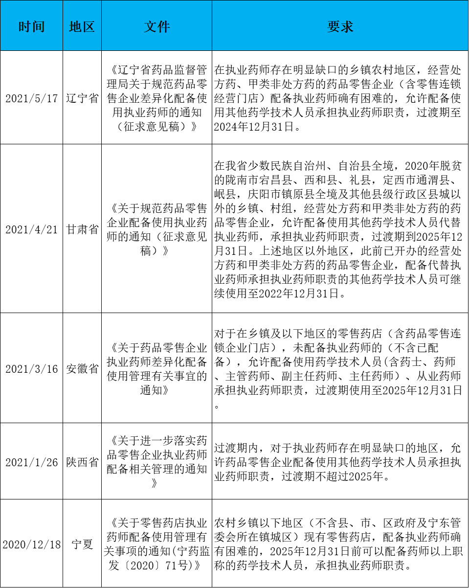 除了山西和青海,不少地區(qū)也發(fā)文規(guī)定,實(shí)施差異化配備使用執(zhí)業(yè)藥師的過渡政策。具體如下: