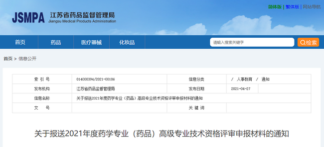 日前,江蘇省藥監(jiān)局發(fā)布了《關(guān)于報送2021年度藥學專業(yè)(藥品)高級專業(yè)技術(shù)資格評審申報材料的通知》(以下簡稱《通知》)。