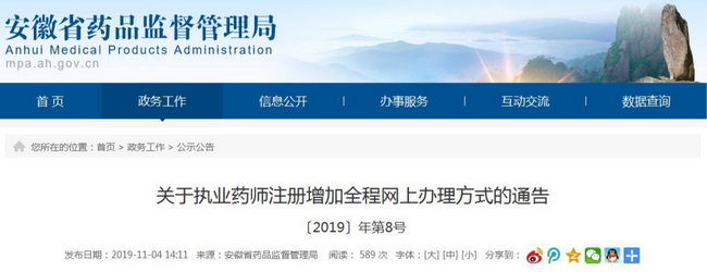 2019年11月4日,安徽省藥品監(jiān)督管理局決定在安徽省全省范圍內(nèi)增加執(zhí)業(yè)藥師注冊全程網(wǎng)上辦理方式,實現(xiàn)執(zhí)業(yè)藥師注冊從“最多跑一次”升級到“一次都不用跑”。