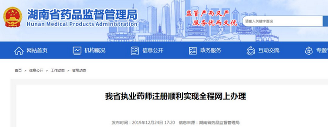 為全面推行“一件事一次辦”,湖南省藥品監(jiān)督管理局從2019年12月16日起,開通湖南省執(zhí)業(yè)藥師注冊全程網(wǎng)上審批,實現(xiàn)了執(zhí)業(yè)藥師注冊證網(wǎng)上受理、網(wǎng)上辦理,網(wǎng)上發(fā)證。