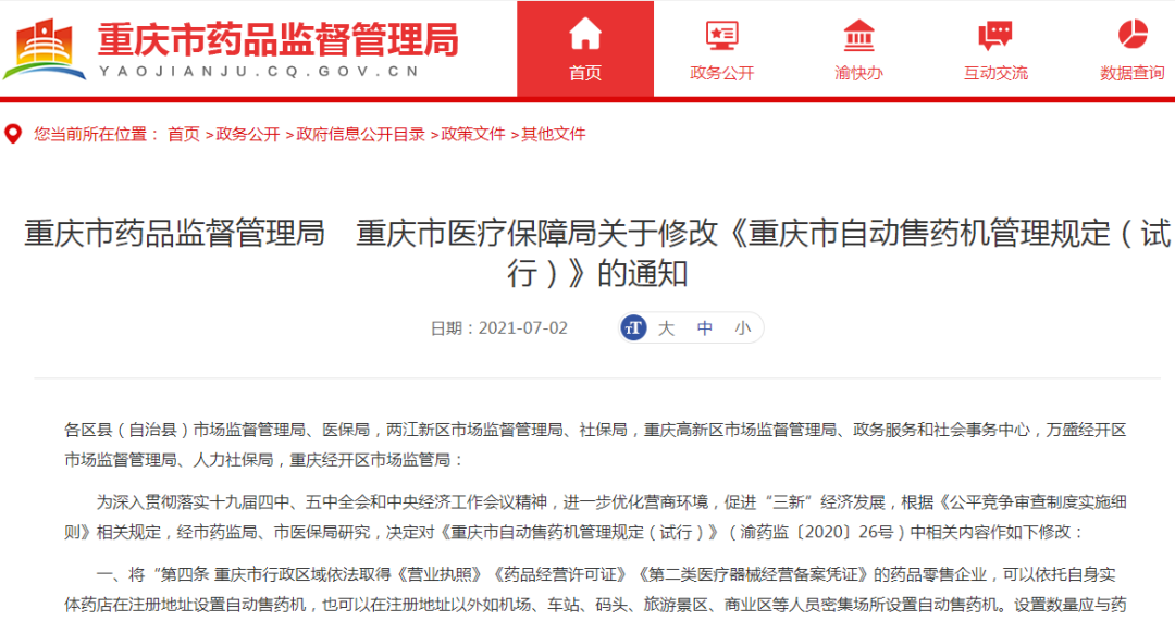 去年7月10日,重慶市藥監(jiān)局聯(lián)合醫(yī)保局發(fā)布了《重慶市自動售藥機(jī)管理規(guī)定(試行)》(以下簡稱《規(guī)定》),并在幾天后對該《規(guī)定》進(jìn)行了政策解讀,并明確了該《規(guī)定》的制定背景、依據(jù)以及核心舉措和注意事項。