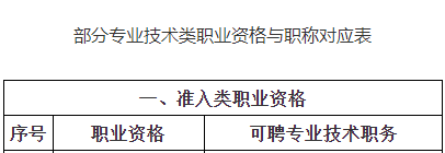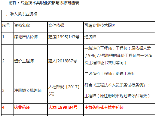 《關(guān)于深化職稱制度改革的意見》通知:取得房地產(chǎn)估價師、造價工程師、注冊城鄉(xiāng)規(guī)劃師、執(zhí)業(yè)藥師、注冊安全工程師、注冊核安全工程師、注冊驗(yàn)船師、注冊計(jì)量師、注冊測繪師、注冊消防工程師、護(hù)士執(zhí)業(yè)資格、醫(yī)師執(zhí)業(yè)資格、執(zhí)業(yè)藥師等12項(xiàng)準(zhǔn)入類職業(yè)資格的人員,用人單位可根據(jù)相關(guān)任職條件和崗位空缺情況聘任相應(yīng)的專業(yè)技術(shù)職務(wù)。