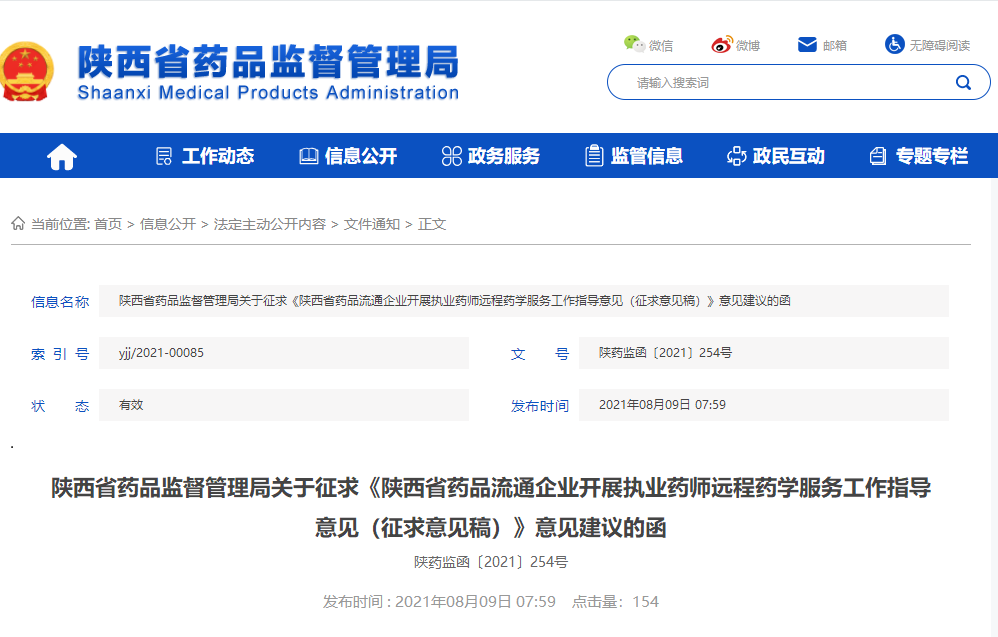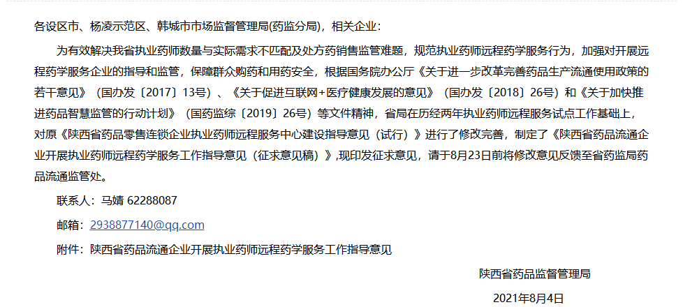 8月9日,陜西省藥監(jiān)局公布了《陜西省藥品流通企業(yè)開展執(zhí)業(yè)藥師遠(yuǎn)程藥學(xué)服務(wù)工作指導(dǎo)意見(征求意見稿)》(以下簡(jiǎn)稱《指導(dǎo)意見》),并對(duì)外征求意見。從中我們發(fā)現(xiàn):藥店遠(yuǎn)程藥事要求改了,執(zhí)業(yè)藥師遠(yuǎn)程藥事只能作為執(zhí)業(yè)藥師不在崗時(shí)的補(bǔ)充。