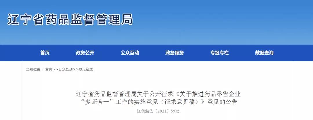近日,遼寧省藥監(jiān)局發(fā)布《關(guān)于推進(jìn)藥品零售企業(yè)“多證合一”工作的實(shí)施意見(jiàn)(征求意見(jiàn)稿)》(以下簡(jiǎn)稱“意見(jiàn)”),以簡(jiǎn)化審批手續(xù),提高審批效率。