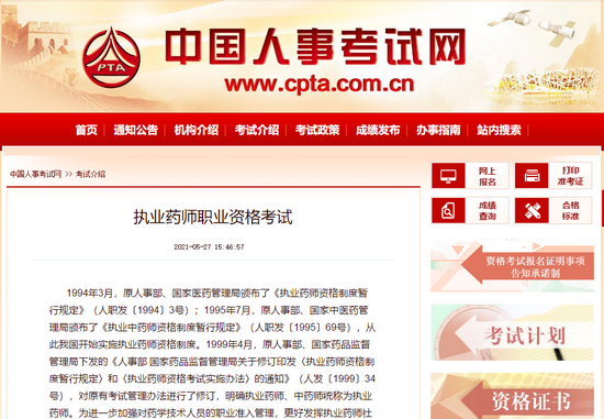 2021年5月27日,中國(guó)人事考試網(wǎng)更新了《執(zhí)業(yè)藥師資格考試》的內(nèi)容,對(duì)執(zhí)業(yè)藥師報(bào)考條件、報(bào)名辦法及告知承諾制、成績(jī)管理、證書(shū)管理等方面出了具體的規(guī)定。